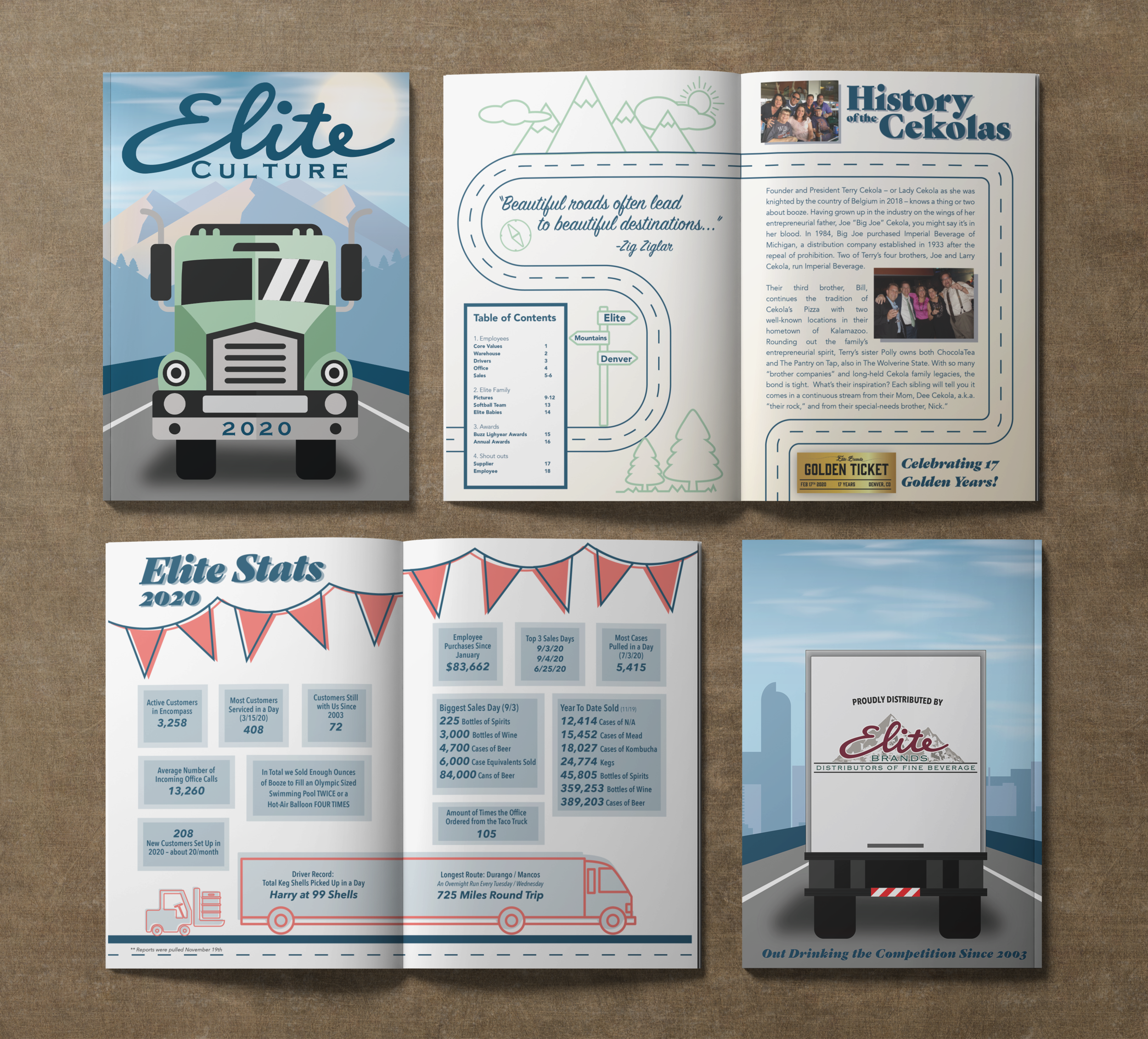This is the very first Culture book that was made for Elite. It was one of my bigger projects that I am very proud of. I brought this idea to my boss during the pandemic when culture was becoming a struggle at the company. This book lifted spirits and brought a new everyone together. This project took me two months, designing and gathering all the information to put this together. This book consist of 24 pages from Elites background, department pages, awards, new babies, testimonials, Elite Softball team and more.